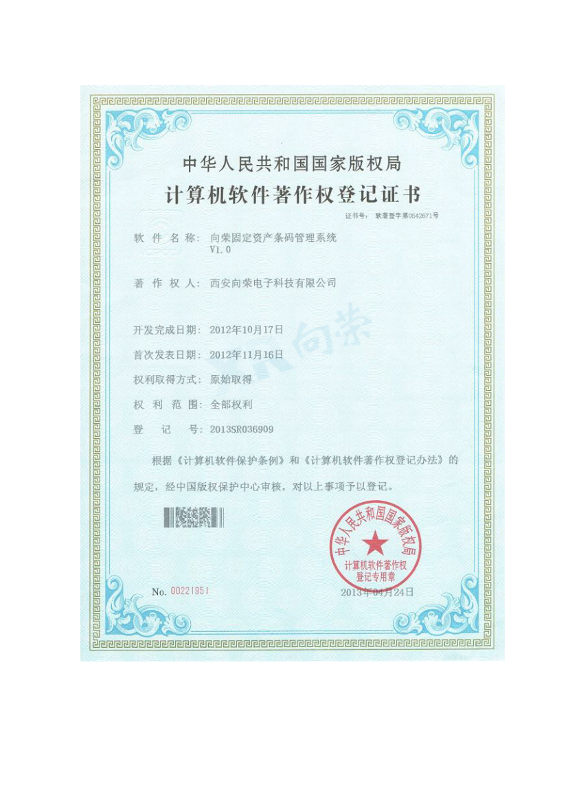 當前位置 > 主頁 > 榮譽資質 > 恭喜向榮取得向榮固定資產條碼管理系統軟件著作權登記證書