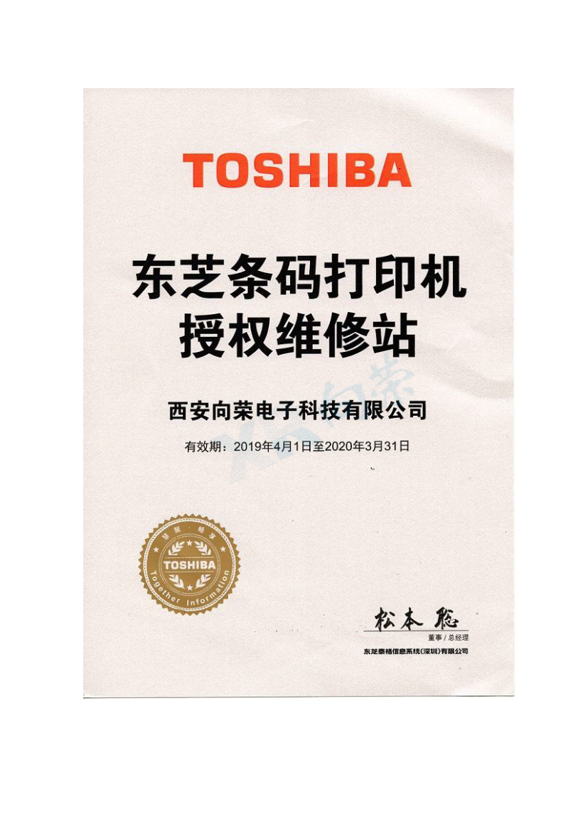 當前位置 > 主頁 > 榮譽資質 > 恭喜西安向榮榮獲 東芝(TOSHIBA)條碼打印機授權維修站