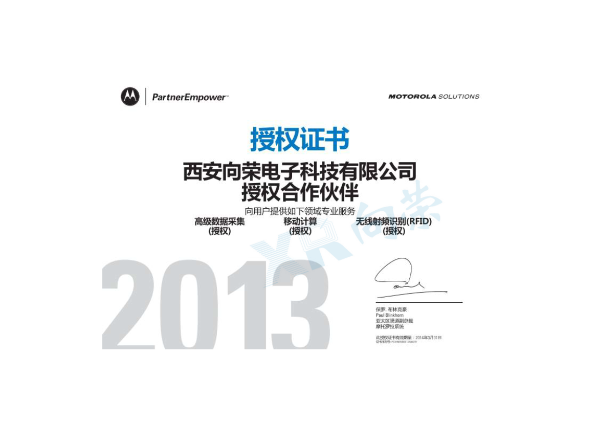恭喜西安向榮榮獲摩托羅拉合作伙伴授權書