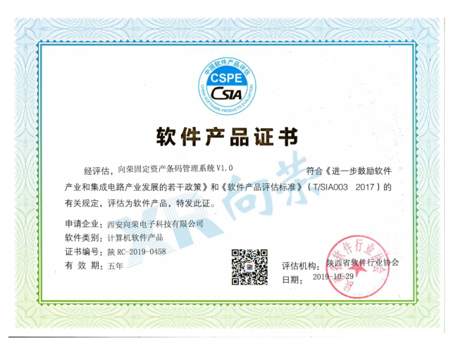 當前位置 > 主頁 > 榮譽資質 > 恭喜西安向榮獲得軟件產品證書(向榮固定資產條碼管理系統)