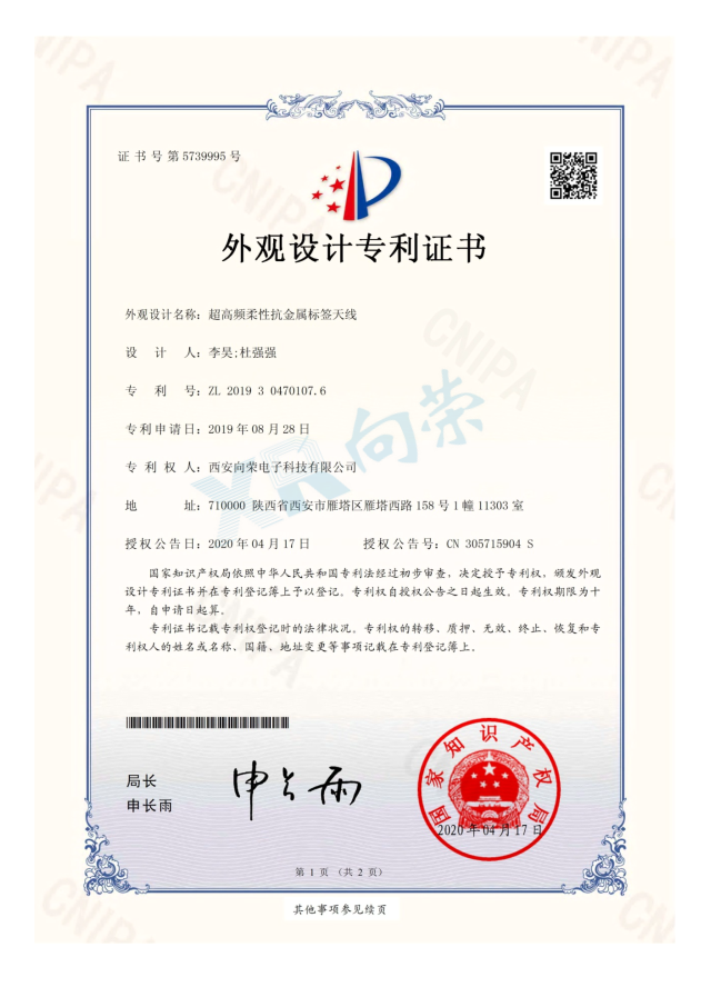 當前位置 > 主頁 > 榮譽資質 > 恭喜西安向榮榮獲“超高頻柔性抗金屬標簽天線外觀設計專利證書”