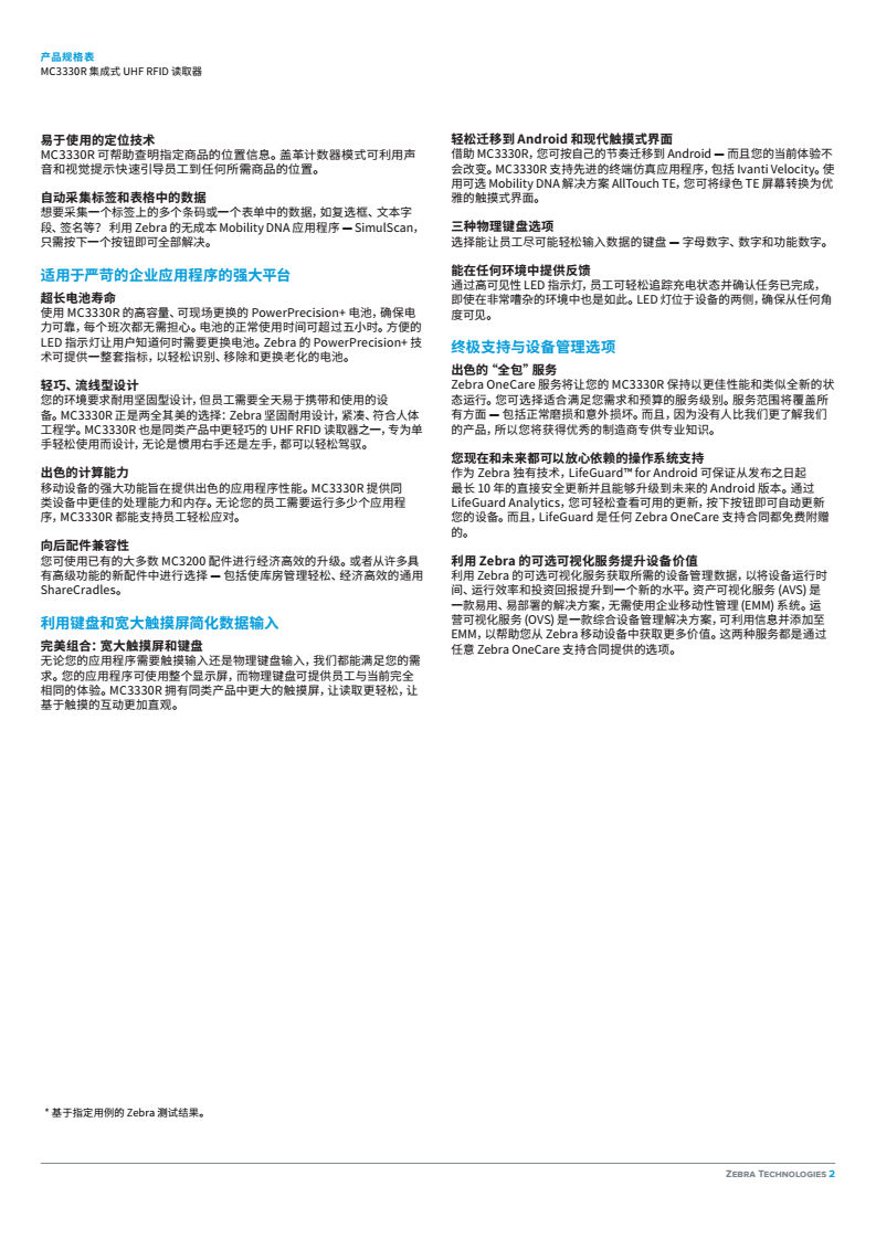 MC3330R RFID 手持讀取器可為您的 RFID 應用帶來全新水準的舒適度、速度、易用性和準確性。卓越的 RFID 讀取性能和接收器靈敏度可快速、準確地掃描極具挑戰性的 RFID 標簽。MC3330R 采用 Zebra 標志性的耐用設計,專為實現更長運行時間打造,同時兼顧輕巧、符合人體工程學特點,可確保全天舒適使用。大觸摸屏、物理鍵盤和 Android 操作系統可為您今天和未來的 RFID 應用需求提供直觀、靈活的平臺。