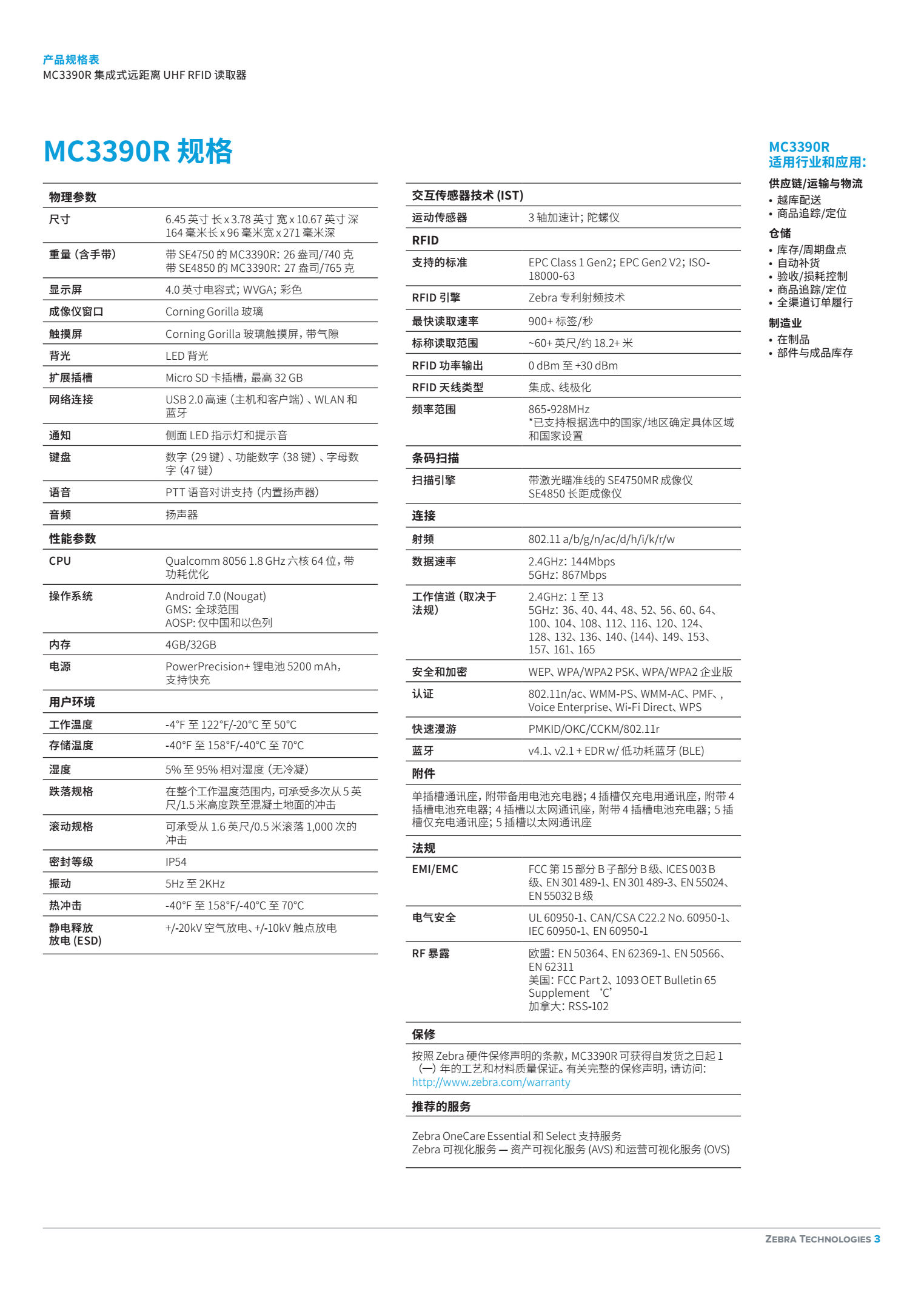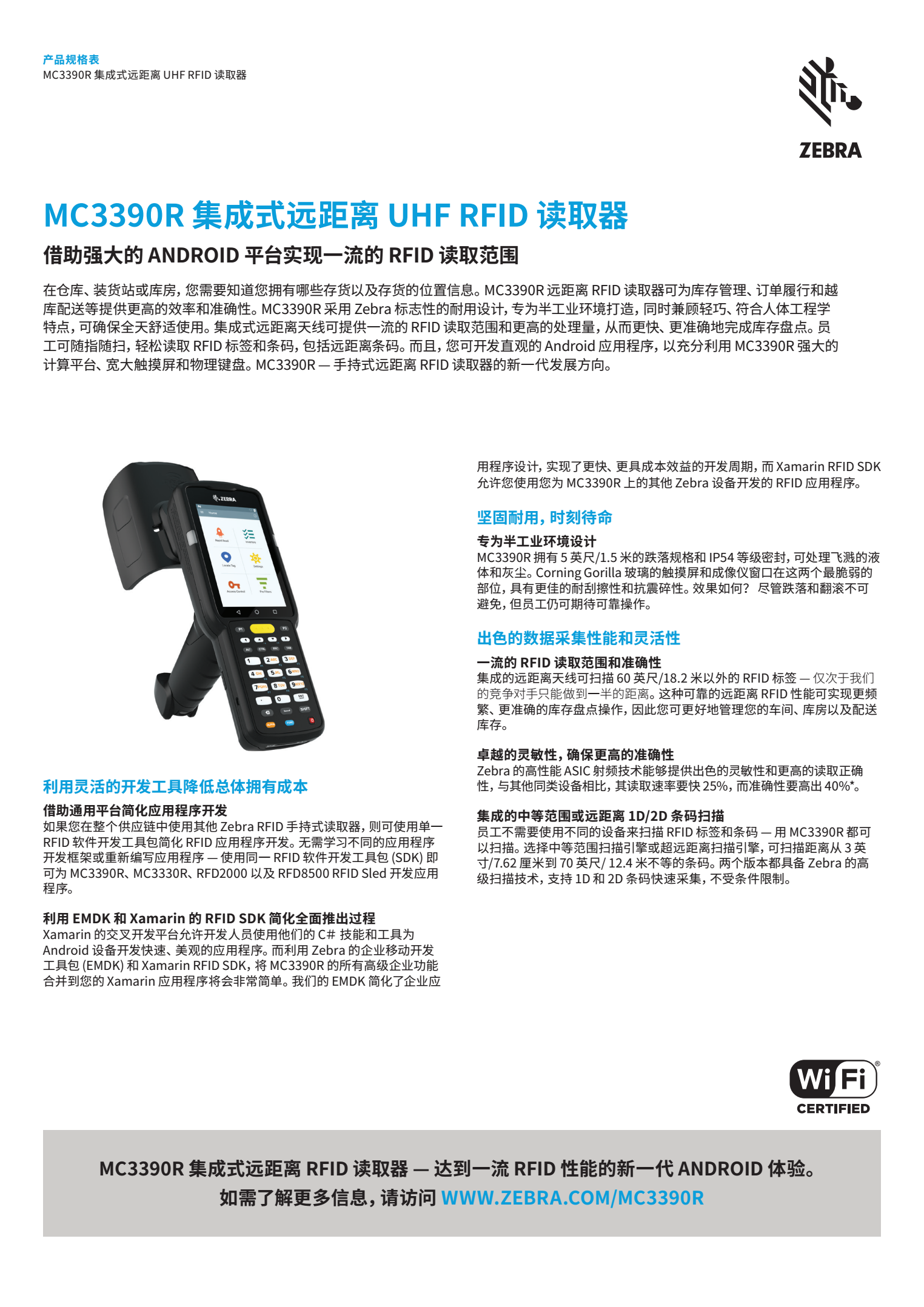 MC3390R 遠(yuǎn)距離 RFID 手持讀取器可為庫存管理、訂單履行和越庫配送等提供更高的效率和準(zhǔn)確性。集成式遠(yuǎn)距離天線支持一流的 RFID 讀取范圍,再加上 Zebra 的高性能 ASIC 射頻技術(shù),可提供更高的處理量,從而更快、更準(zhǔn)確地完成庫存盤點(diǎn)。MC3390R 采用 Zebra 標(biāo)志性的耐用設(shè)計(jì),專為半工業(yè)環(huán)境打造,同時(shí)兼顧輕巧、符合人體工程學(xué)特點(diǎn),可確保全天舒適使用。大觸摸屏、物理鍵盤和 Android 操作系統(tǒng)可為您今天和未來的 RFID 應(yīng)用需求提供直觀、靈活的平臺(tái)。
