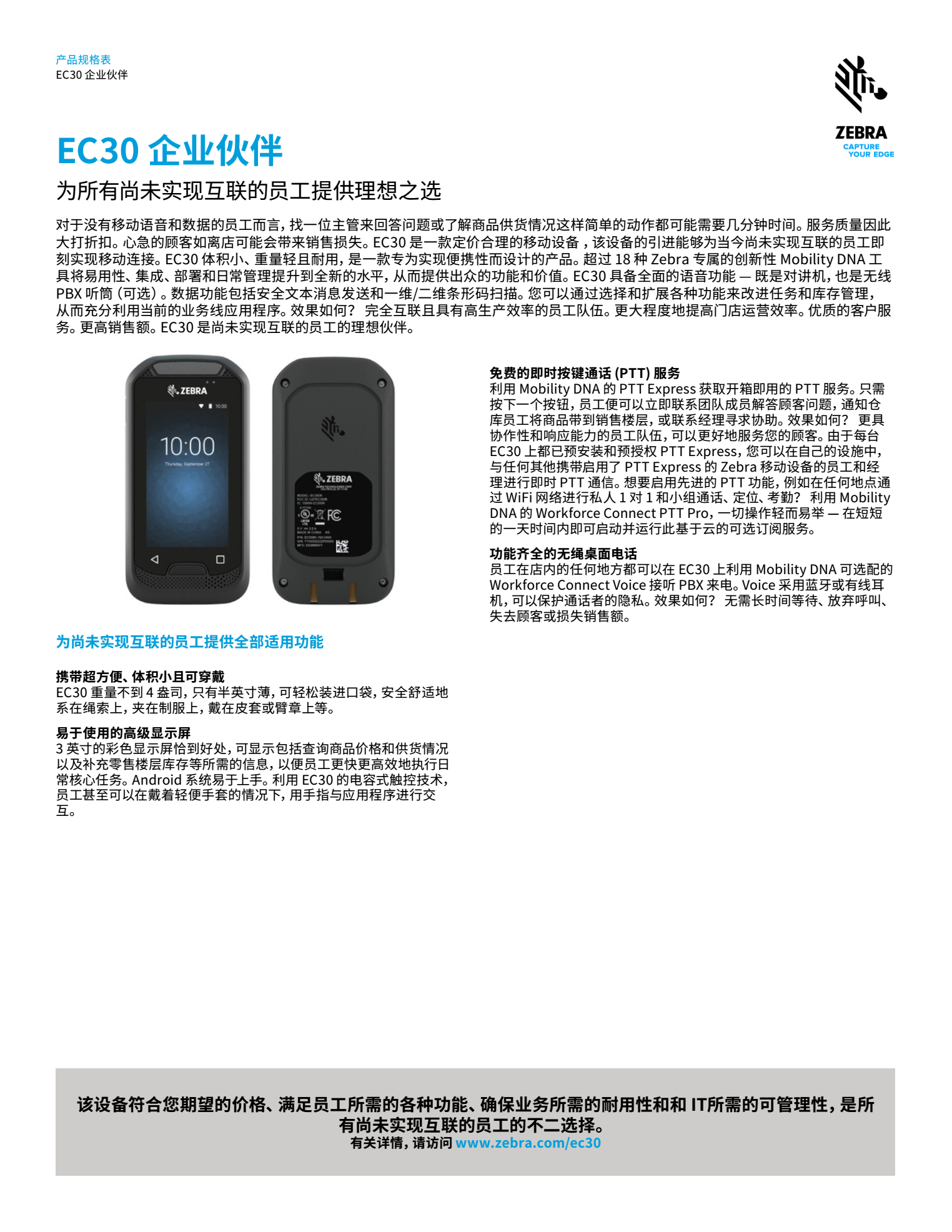 對于沒有移動語音和數據的員工而言,向主管匯報工作或了解商品供貨情況等簡單的行動都需要花費幾分鐘時間,影響服務質量和銷售。EC30 這款移動設備定價合理,該設備的引進能夠為當今尚未實現互聯的員工即刻實現移動連接。這款輕薄卻堅固的小型設備可為您的員工提供所需的移動語音和數據功能,幫助其提高核心日常任務的效率和準確性。
