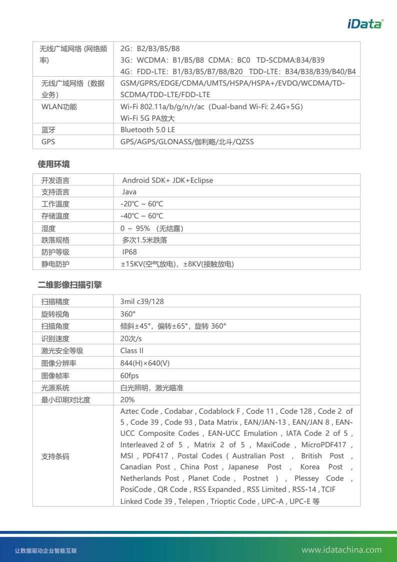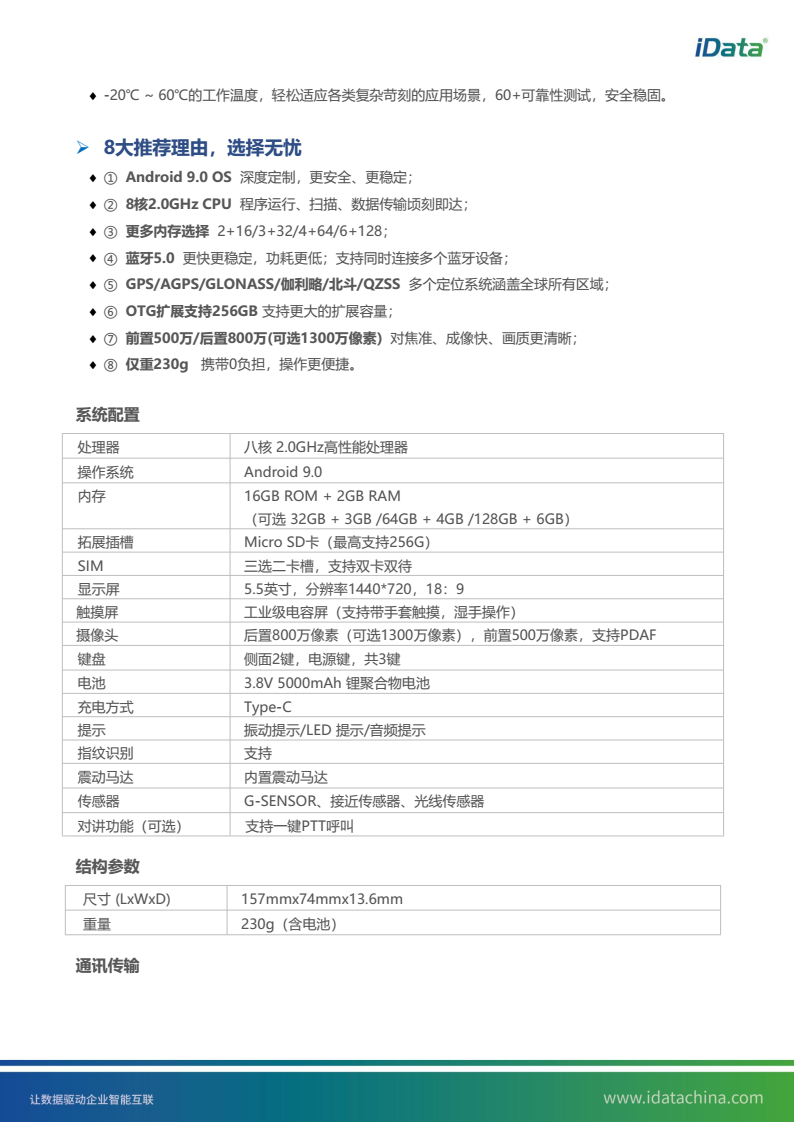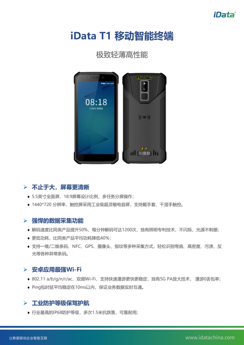 iData T1移動智能終端,企業級Android9.0操作系統,支持自由定制、匹配各種商用場景APP應用。5.5英寸全面屏,18:9屏幕設計比例,多任務分屏操作。8核2.0GHz CPU程序運行、掃描、數據傳輸頃刻即達。2+16/3+32/4+64/6+128更多內存選擇操作流暢不卡。工業防護等級保駕護航,行業最高的IP68防護等級,多次1.5米抗跌落,可靠耐用。纖薄設計,重量230 克,隨身攜帶更輕松,長時間使用毫不疲累。