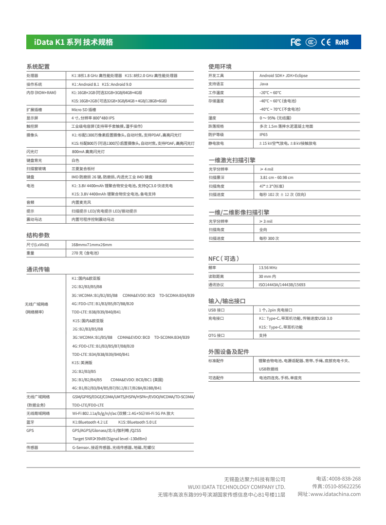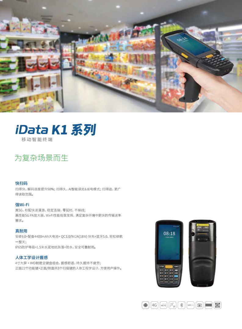 產品簡介: iData K1移動智能終端,為場景而生。人體工程學設計,舒適握感;配備最新的安卓操作系統,八核高端CPU,帶給你飛一般的流暢系統體驗;Wi-Fi傳輸穩定高速,全場景覆蓋;整機重量僅270g,輕巧便攜,可靠耐用;輕松滿足自由深度定制的所有需求。