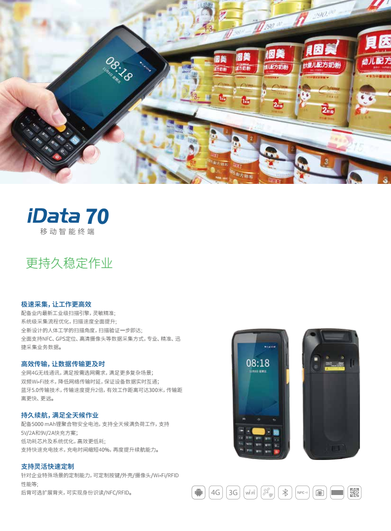產品簡介: iData 70——智能互聯時代高效移動智能終端:大屏與單手按鍵操作完美平衡,更穩定高速的數據采集與傳輸,全性能與超高性價比平衡。