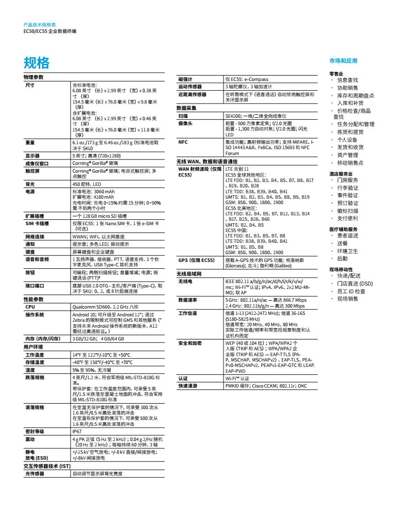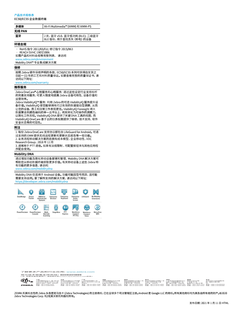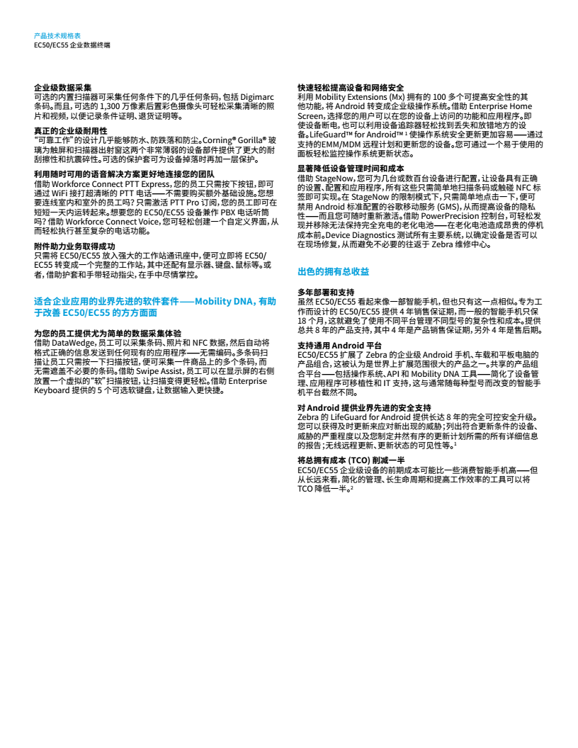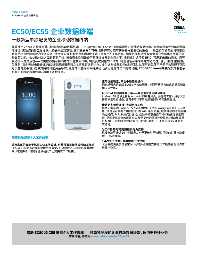 隆重推出 EC50 和 EC55——Zebra 非常薄、非常輕的移動數據終端,且還帶有集成掃描器。您可獲得各方面俱佳的設備——員工希望擁有的具有真正智能手機外觀和感覺的業務設備;適合全天候業務使用的耐用性;員工提高個人工作效率、加強協作以及將設備價值提升到新水平所需的所有業務功能。并且這兩種型號可滿足設施內和外出到現場的員工的需求——僅支持 WiFi 的 EC50 或支持 WiFi/蜂窩網絡的 EC55。