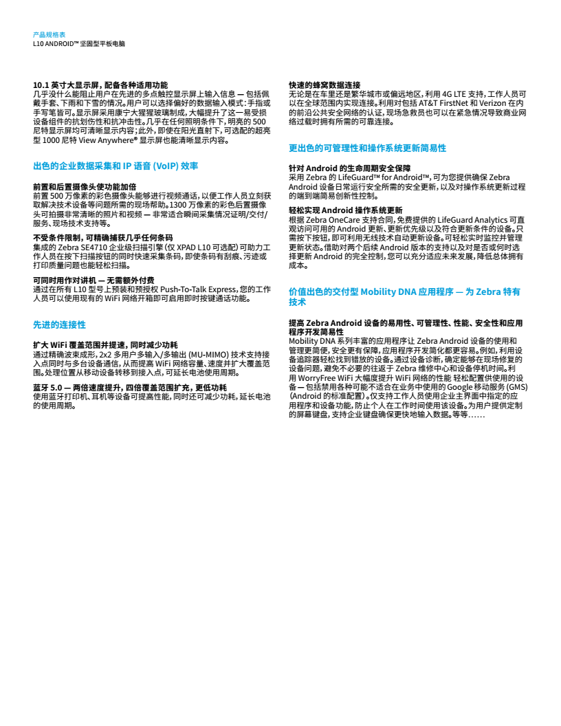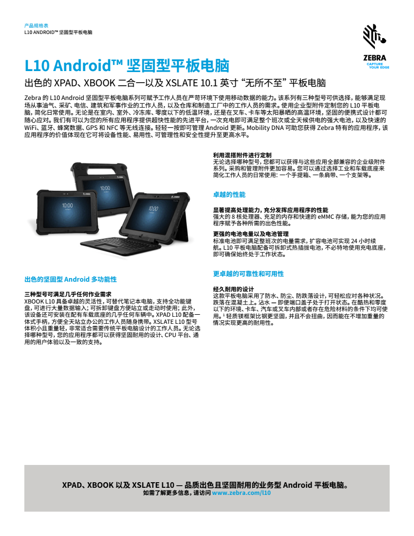 不管移動工作人員是喜歡單板式平板電腦 (XSLATE L10)、帶有剛性手柄和內(nèi)置條碼讀取器選件的平板電腦 (XPAD L10),還是配備全功能背光鍵盤的二合一筆記本電腦/平板電腦 (XBOOK L10),Zebra L10 所具有的功能靈活性和可定制性可為工作人員提供合適的終端計算工具,助力其在所處的環(huán)境下出色發(fā)揮。