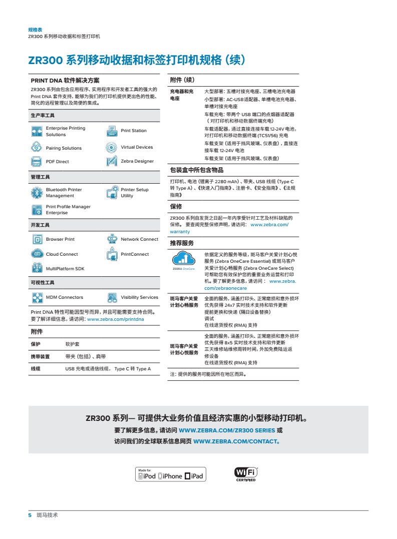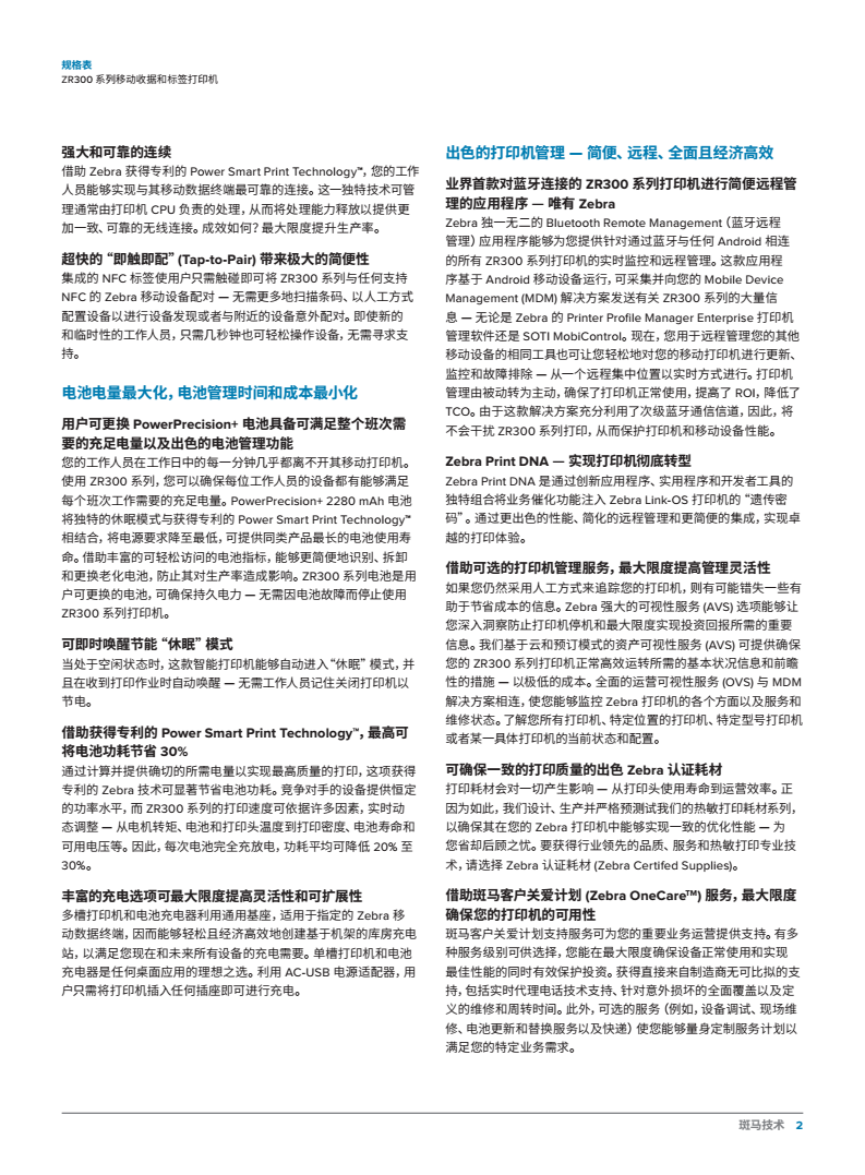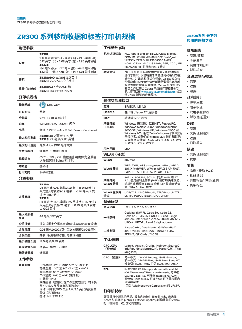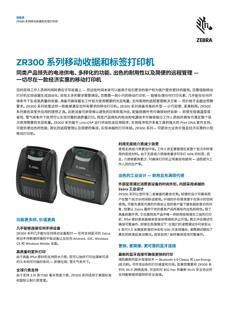 產品簡介: 可提供大業務價值且經濟實惠 同類產品更為先進的電池供電、多樣化的功能、出色的耐用性以及簡便的遠程管理 — 一切盡在這款經濟實惠的 ZR300 系列 移動打印機,是各類室內、室外應用的理想之選。