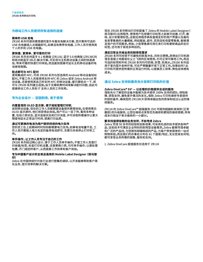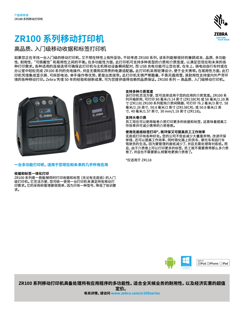 使用 ZR100系列 移動打印機(jī)可提高效率,改善工作流。這款經(jīng)濟(jì)實(shí)惠的打印機(jī)可以打印收據(jù)和標(biāo)簽,其采用輕薄設(shè)計(jì),且易于使用。