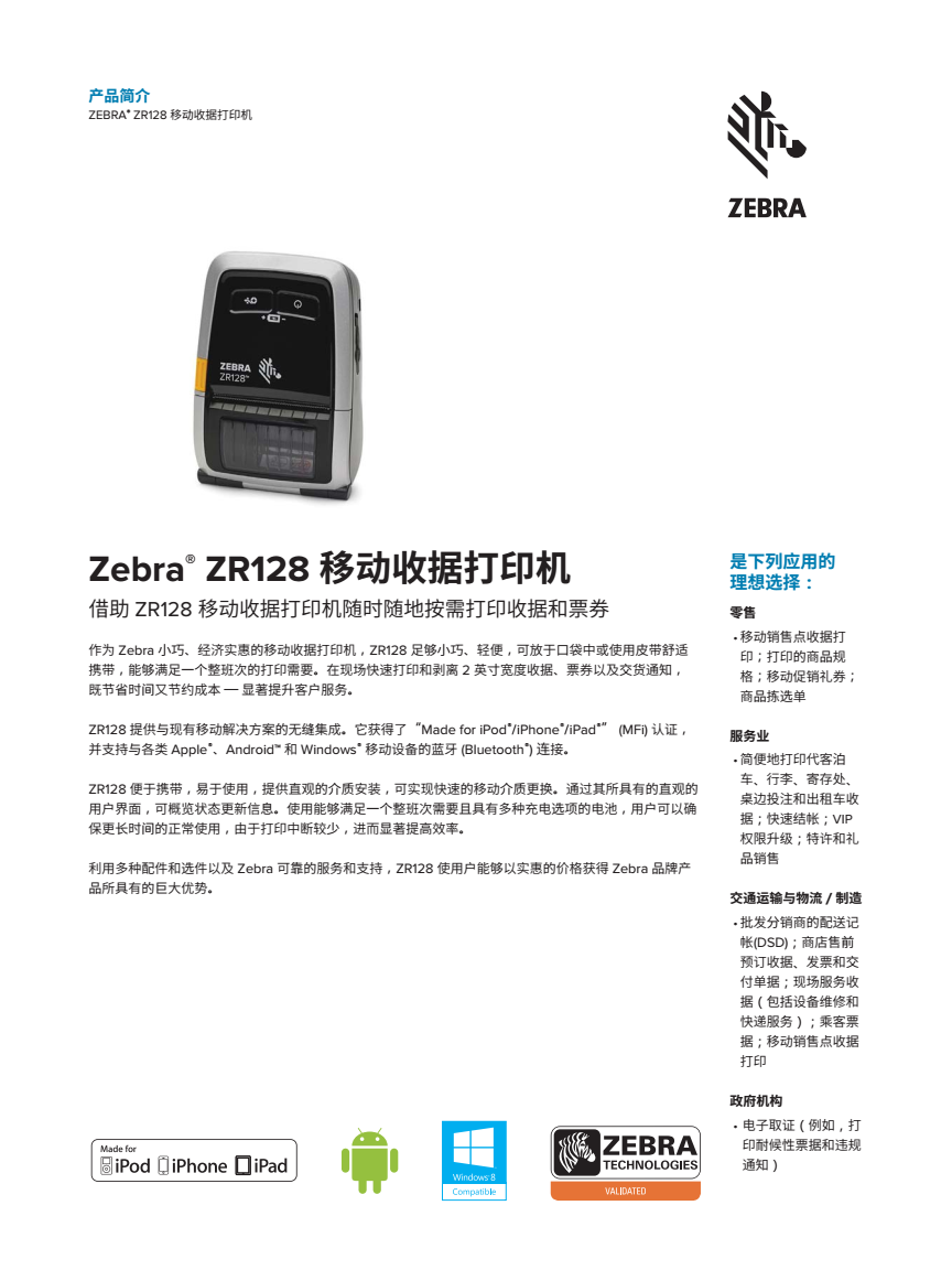 小巧且價格實惠 借助 ZR128 移動 2 英寸收據打印機,按需以移動方式打印收據和票券。作為 Zebra 小巧且價格實惠的移動收據打印機, ZR128 配備了一些重要的基本特性,并提供一系列有競爭力的配件。