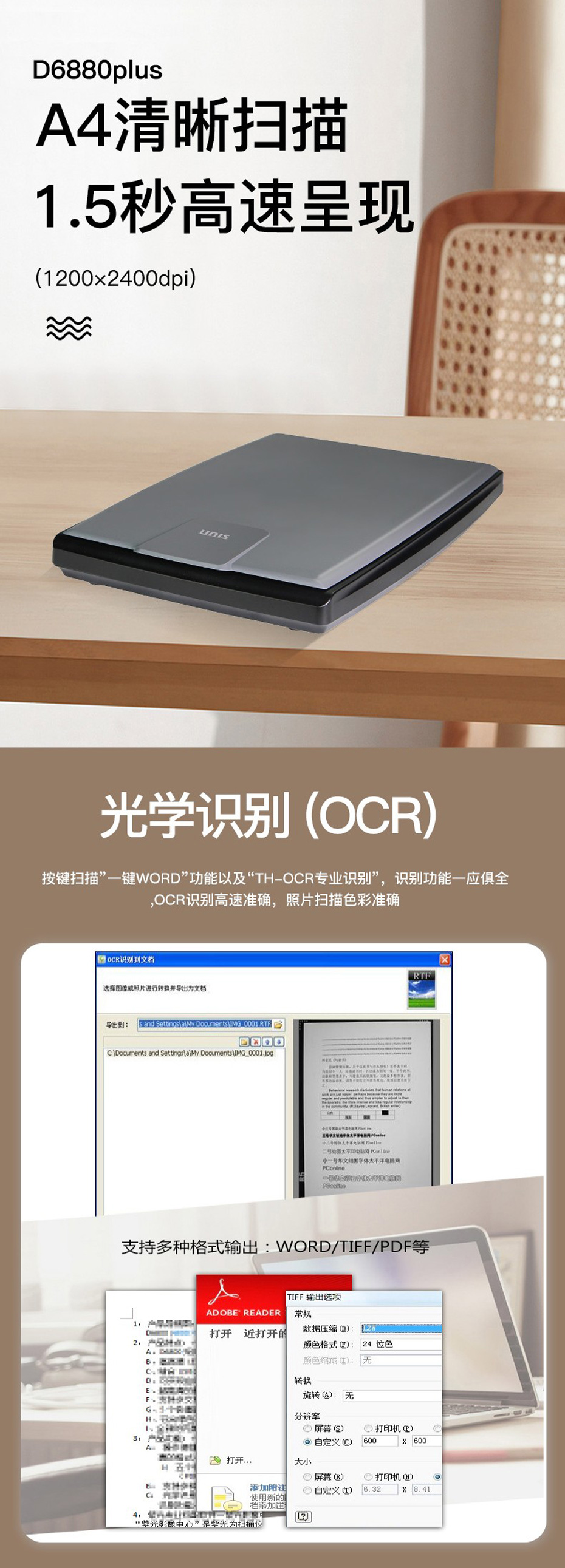 Uniscan D6880 Plus操作簡單,功能強大。可只能裁切糾偏去網紋,可自定義水印等,掃描快速,呈現效果清晰。