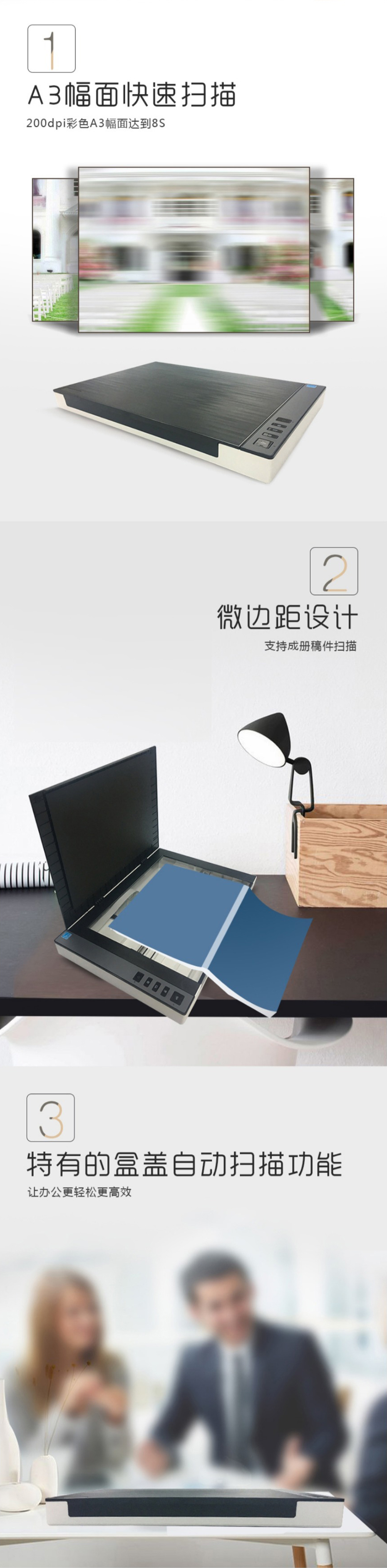 產品簡介: 1、 超薄A3大幅面平板掃描 2、微邊距設計,支持成冊稿件掃描 3、A3快速掃描,辦公更高效 4、48-bit寬廣色域,色彩更逼真 5、便利快捷掃描按鍵 6、盒蓋感應自動掃描,輕松又省時 7、自動裁切糾偏及影像強化功能 8、符合國產安全受控標準,選配公文流轉管控方案 9、支持國家版式文檔OFD格式