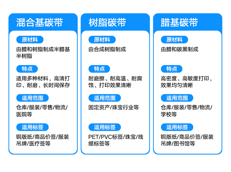 您可以在蠟基、蠟基/樹脂基和樹脂基三種碳帶中進行選擇,以便在與斑馬的熱轉印材料理想匹配的情況下,滿足耐用性方面的應用需求。這些碳帶適用于 ZEBRA 的所有工業和桌面打印機。而且,ZEBRA 的蠟基/樹脂基以及樹脂基碳帶經過 UL 認證。