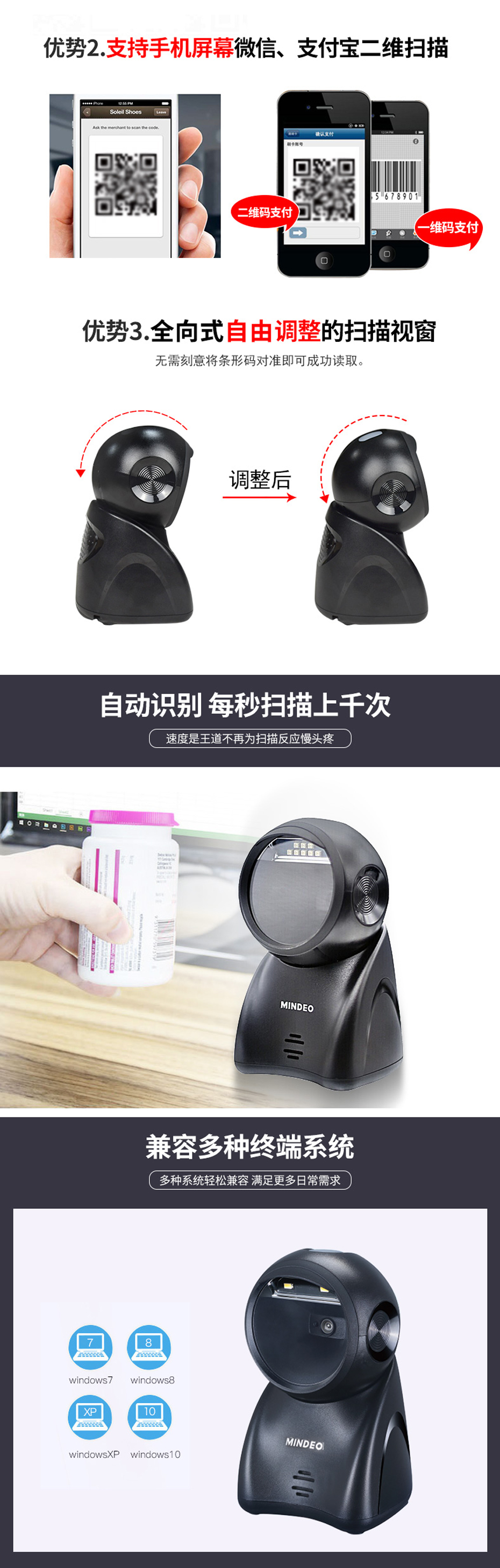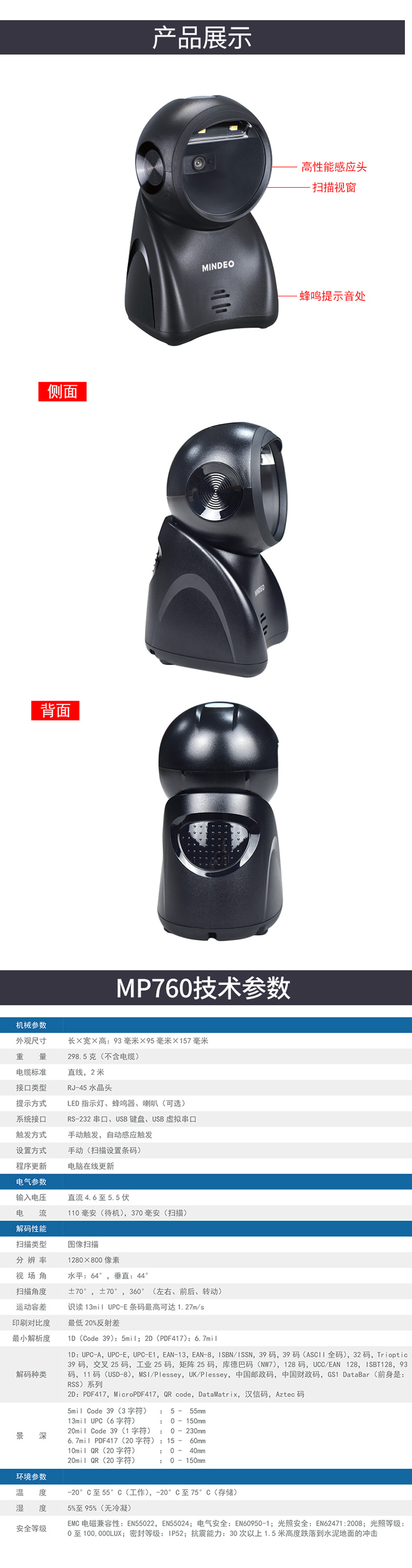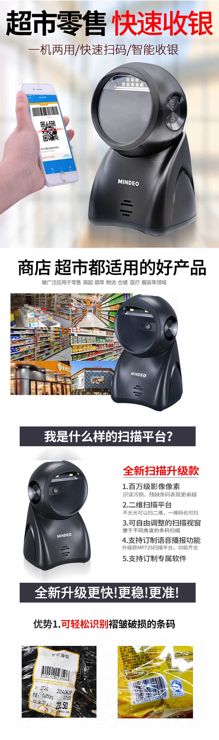 產品簡介: 民德M760條碼掃描器,一機兩用,超市零售掃貨、快速收銀,小體積,大作用。