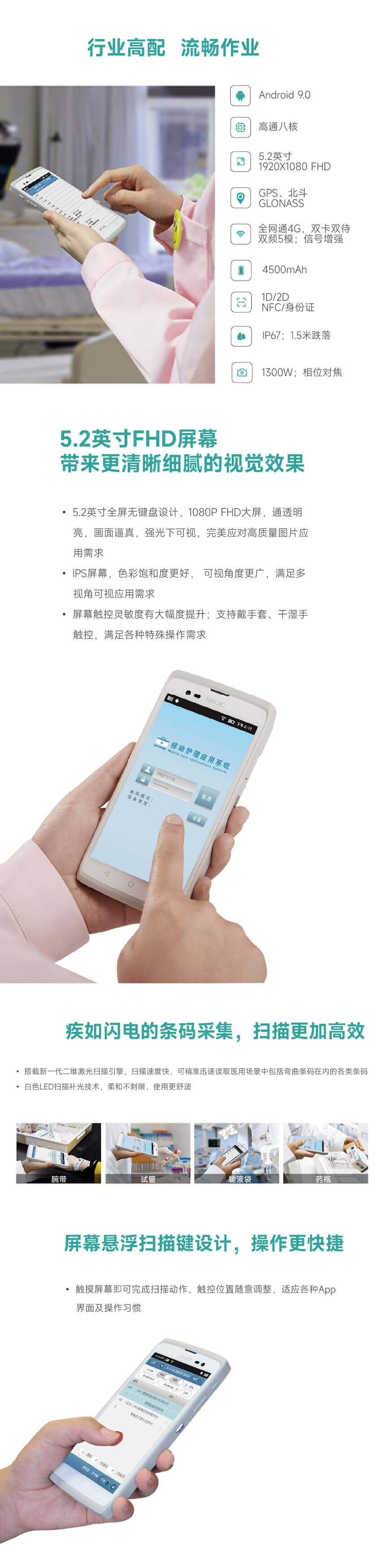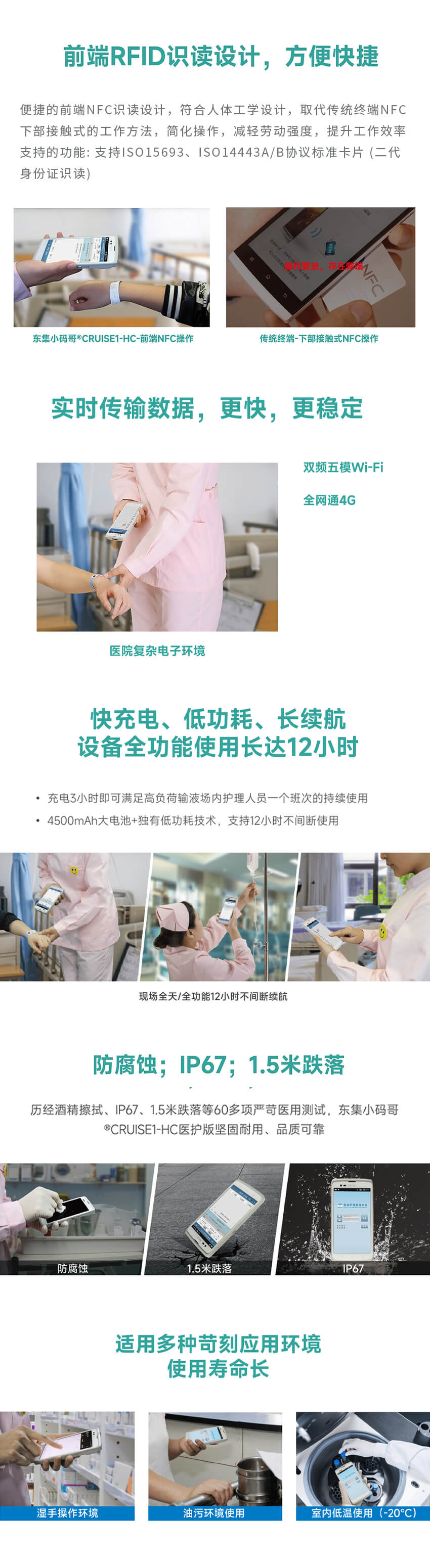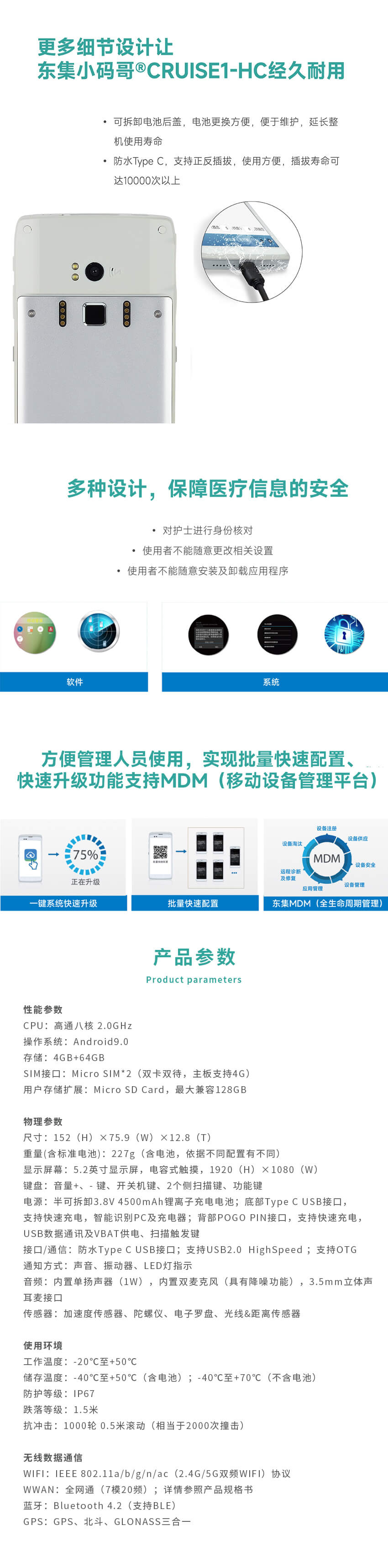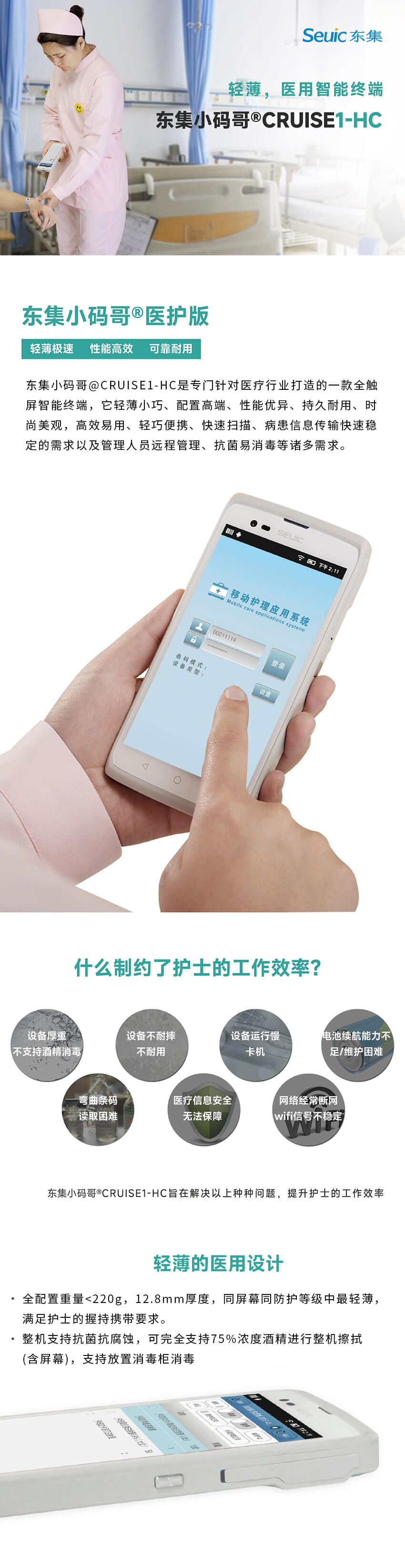 東集小碼哥@CRUISE1-HC是專門針對醫(yī)療行業(yè)打造的一款全觸屏智能終端,它輕薄小巧、配置高端、性能優(yōu)異、持久耐用、時尚美觀,滿足護(hù)士在使用時對設(shè)備高效易用、輕巧便攜、快速掃描、病患信息傳輸快速穩(wěn)定的需求以及管理人員遠(yuǎn)程管理、抗菌易消毒等諸多需求。