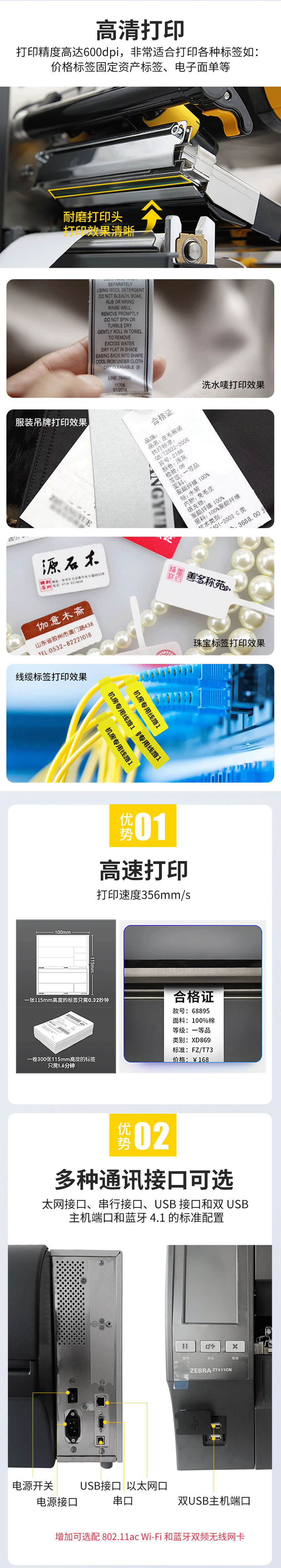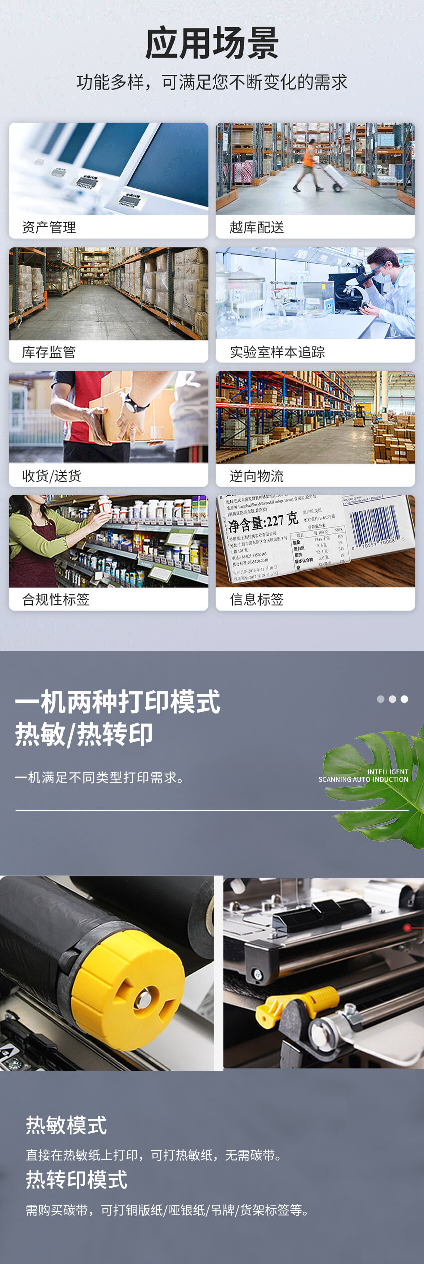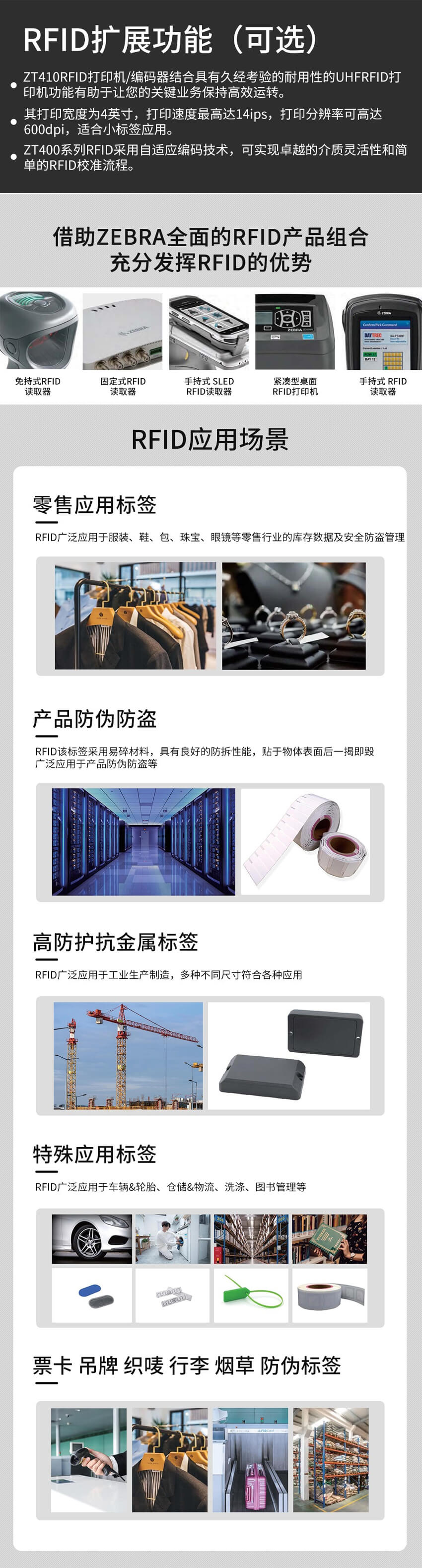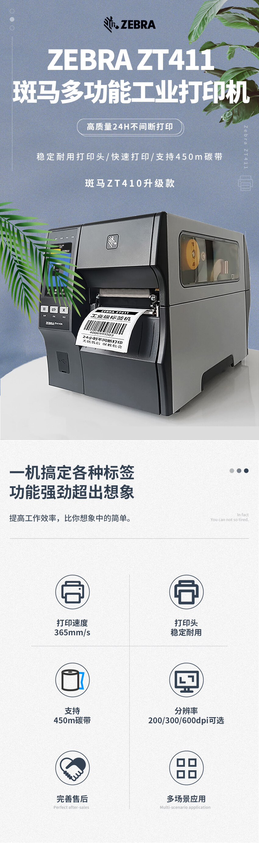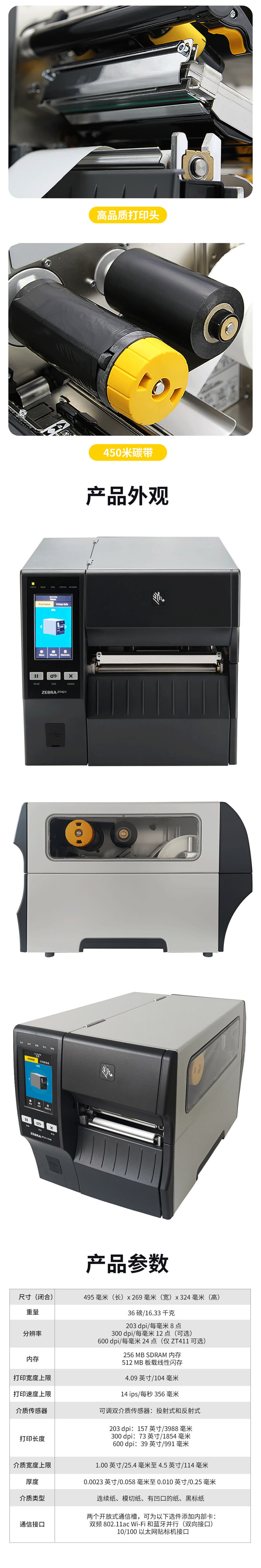 產品簡介: 二維碼不干膠RFID條碼打印機,可選203/300/600dpi,zt410升級款,雙模式快速打印,多行業適用。
