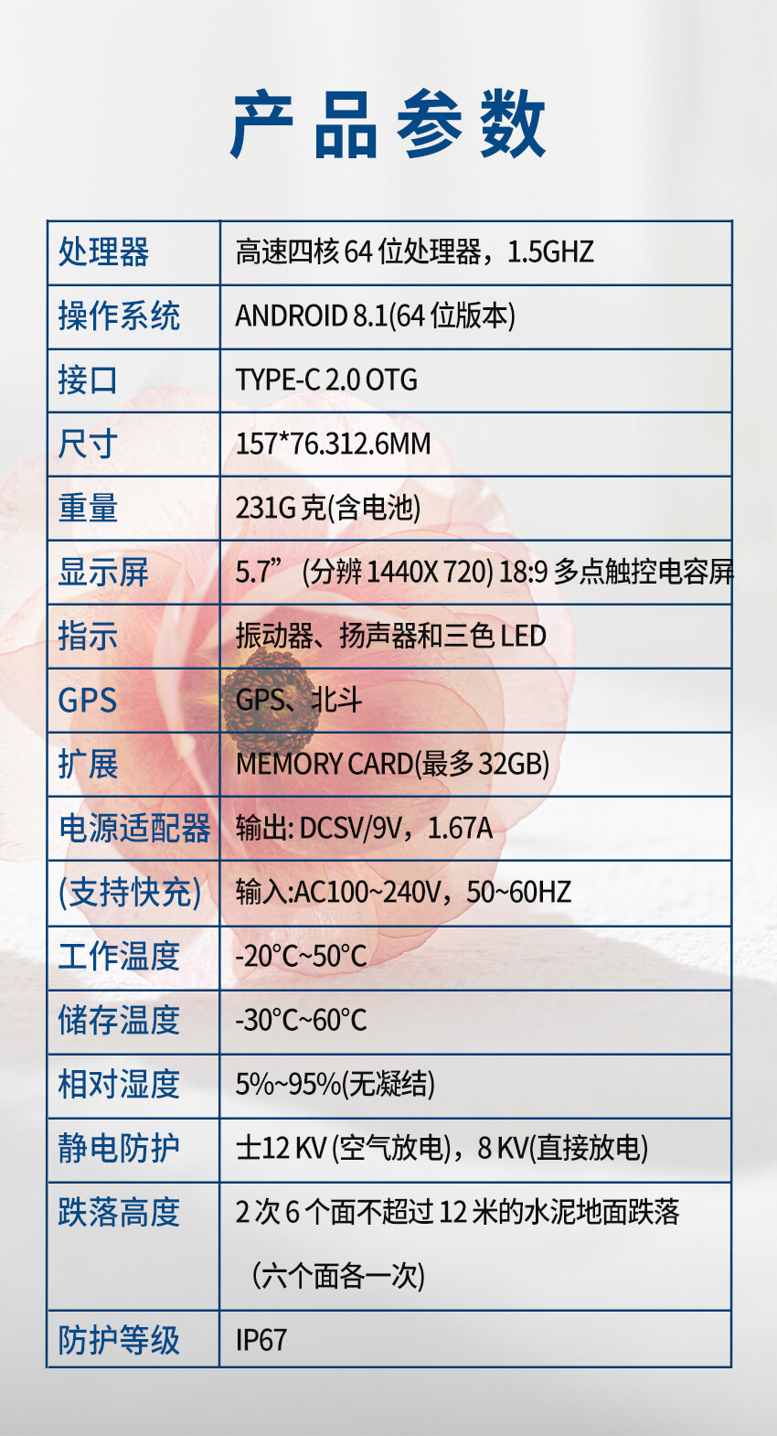 NFT10醫療版機身采用5.7寸(18:9)HD顯示屏,2.5D康寧三代玻璃蓋板,擁有易于消毒的抗菌外殼,IP67高防護等級和12.6mm超薄機身,可配置高速八核處理器,支持指紋識別與快充,適用于醫療衛生場景。