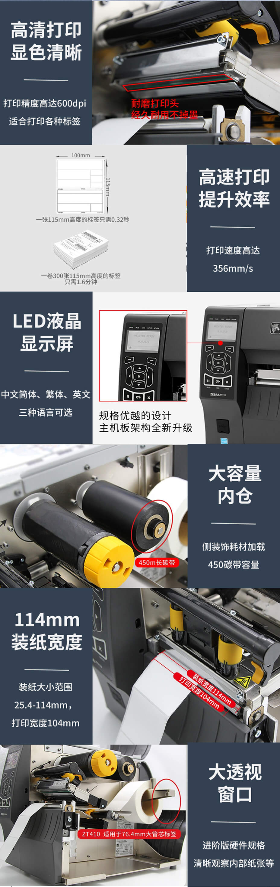 精心設計的 Zebra ZT410打印機經久耐用,在各種應用中展示出卓越的性能。借助此系列的打印機,能夠充分確保您的重要業務高效運營。 ZT410基于Z系列經現場實踐驗證的卓越可靠性構建而成,而且在打印速度、打印質量和連接選項方面有所增強。ZT410打印機具有出色的易用性,它擁有直觀的基于圖標的 LCD 圖形用戶界面,并且易于安裝耗材。此外,ZT410的打印機還包括標準USB 、串行、以太網和Bluetooth功能。擴展的RFID功能提供了更強的追蹤能力、更深入的可見性和企業洞察力。 ZT410為4英寸的機型,標配一系列高級功能,可確保對打印機的投資在現在和未來都能始終滿足您的需求。打印機采用全金屬框架和獨特的折疊門設計, 非常適合在空間有限的環境中使用。借助Zebra的Link-OS環境—— 一個將功能強大的多平臺軟件開發工具包(SDK)與軟件應用程序相結 合的創新操作系統 —— 可以從世界上任何地方輕松地集成、管理和維護ZT410打印機。 Zebra ZT410產品優勢: ◆ 應用靈活性 * 借助各種出色的介質功能和介質提供選項,擴展打印機的性能。 * 通過定制打印機,使當前和未來的業務需求與最終用戶可安裝的介質處理選項相匹配。 * 標準串行、USB、以太網和藍牙功能 — 以及兩個開放式介質插槽 — 使您能夠利用非標準的連接選項。 * 擴展的RFID功能易于安裝,使用簡便。 * 借助高分辨率打印功能,確保小標簽應用的輸出具有出色品質。 ◆ 輕松集成 * USB主機端口可以通過映射和擴展映射驅動器內存功能,輕松傳輸來自USB閃存盤的數據,從而實現簡便的打印機配置。 * 除 ZPL和EPL之外,虛擬設備應用程序使支持Link-OS 的打印機能夠支持一些常用的既有打印機語言和競爭對手的打印機語言 —— 可有效確保您的 投資回報。 ◆ 易于操作 * 動態QR碼提供基于Web的按需支持,可迅速解決打印機錯誤。 * 通過Print Touch,這些支持 Link-OS 的打印機提供了使用近場通信 (NFC) 的網頁啟動功能,便于訪問包含操作指南視頻以及產品支持的Zebra 全面的知識庫。 * 照明式的介質和碳帶路徑便于查看打印機內部,即使在光照較差的環境下仍然如此。 ◆ 管理簡便 * Zebra 的Link-OS環境提供了增強的功能,可以從任何位置監控、管理和維護打印機。 * 云連接使支持Link-OS的打印機能夠安全地直接與云環境交互,進行打印和設備管理。 Profile Manager使您能夠在世界上任何地方編輯和管理網絡中的一臺打印機、批量打印機或所有支持Link-OS的打印機。 ◆ 適用場合 * 制造 – 在制品管理 – 產品 ID /序列號 – 包裝標簽 – 接貨/理貨標簽 * 交通運輸與物流 – 訂單分揀/包裝 – 貨物發送/貨物接收 – 直接換裝 – 合規標簽印制 * 零售 – 配送中心 – 商店后臺操作 * 醫療保健 – 化驗室標簽 – 血庫標簽 – 資產跟蹤 – 藥物標簽打印