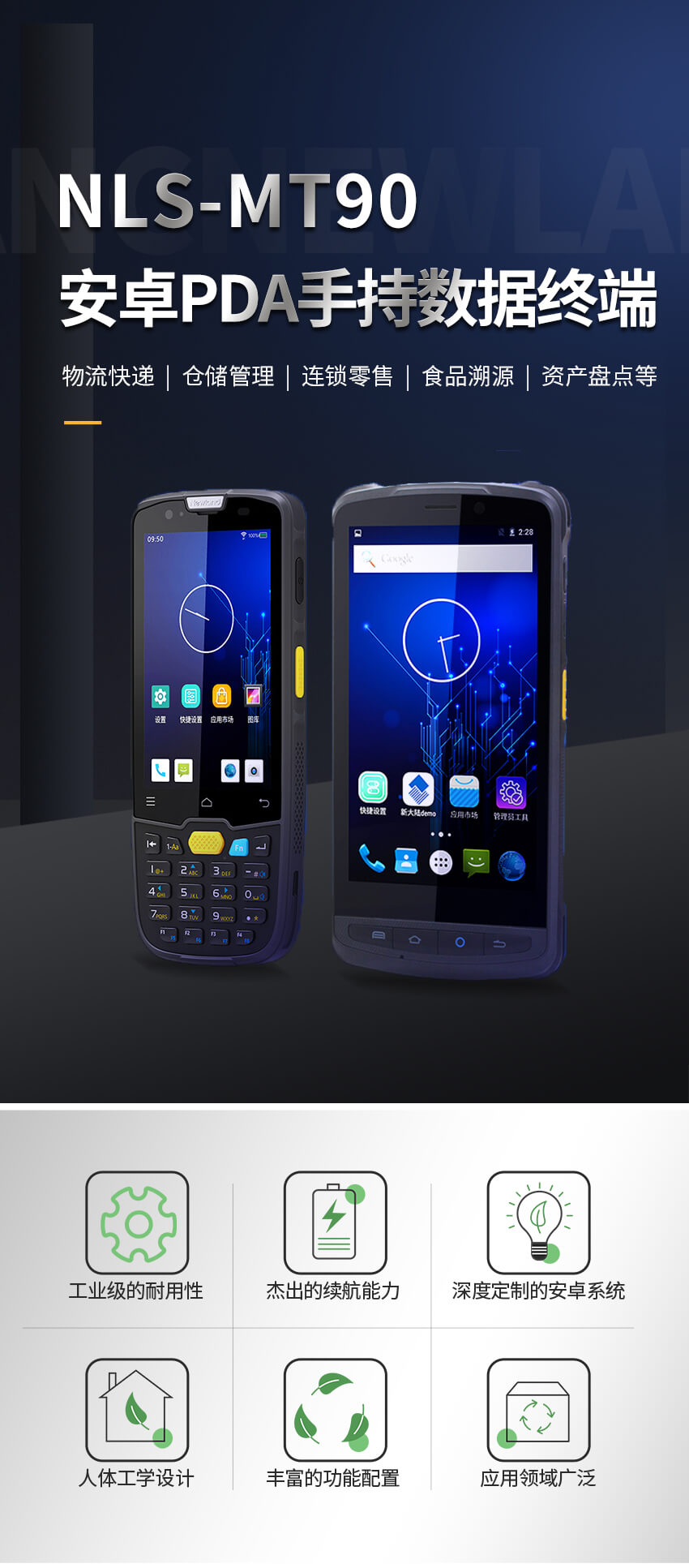 NLS-MT90 便攜式數據采集器內置深度定制的安卓操作系統,擁有工業級的耐用性,4500mAH超大容量電池,支持一維和二維條碼掃描,可通過 4G無線數據通信、Wi-Fi 進行數據的傳輸。 廣泛應用在物流快遞、倉儲管理、連鎖零售、食品溯源、醫療衛生、經銷商管理、資產盤點等行業。