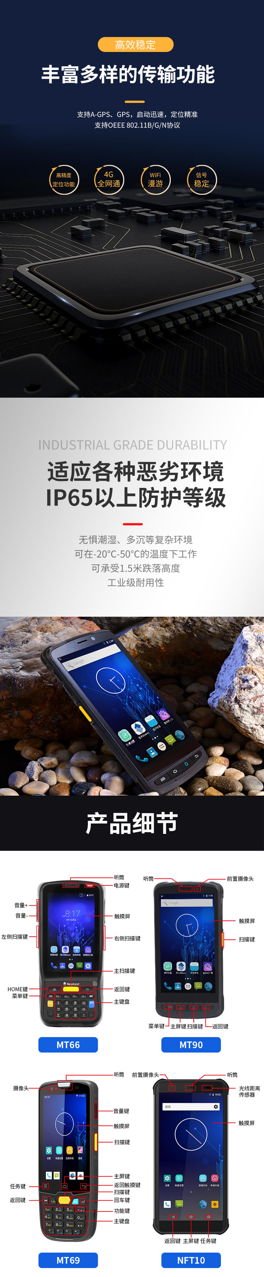 擁有IP65以上的防護等級,能承受六面1.5米跌落高度,即使在多塵、多水的惡劣工業環境中,仍能保證設備正常工作。